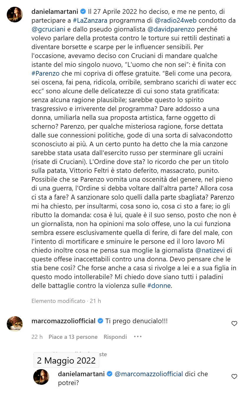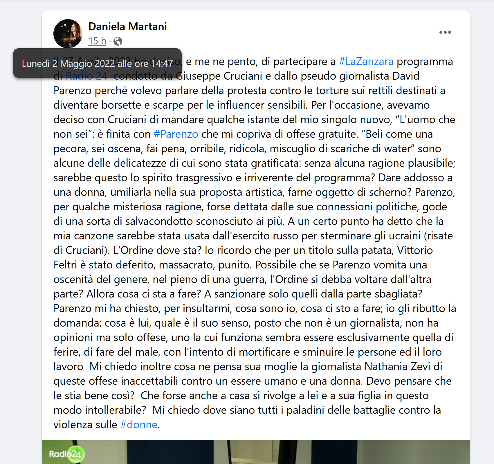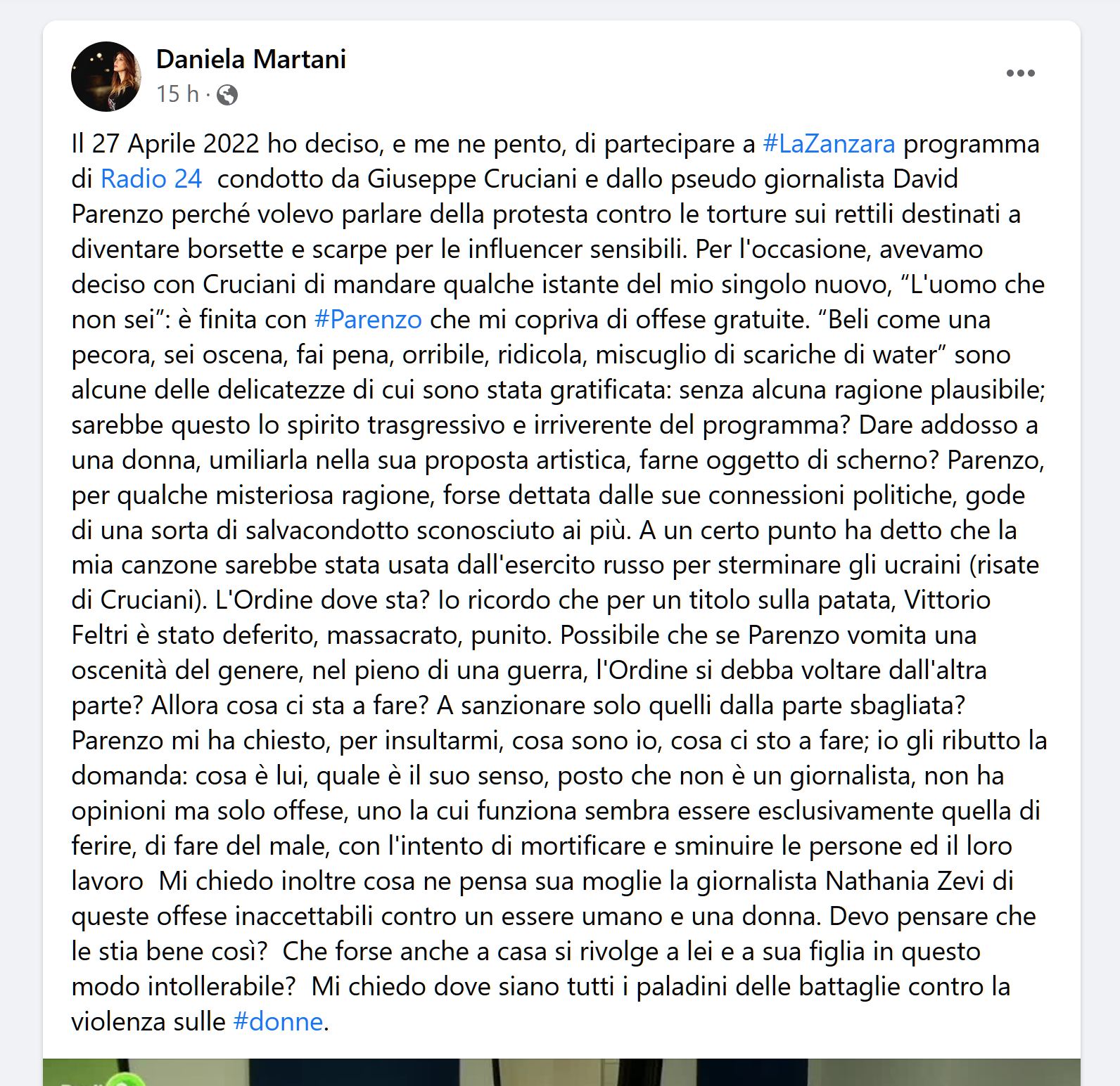 La Martani viene prese alla sprovvista, incassa la scarica di insulti, ma poi risponde in maniera piccata sui social, tirando in ballo la violenza sulle donne: “Il 27 aprile 2022 ho deciso, e me ne pento, di partecipare a La Zanzara programma di radio 24 condotto da Giuseppe Cruciani e dallo pseudo giornalista David Parenzo perché volevo parlare della protesta contro le torture sui rettili destinati a diventare borsette e scarpe per le influencer sensibili.