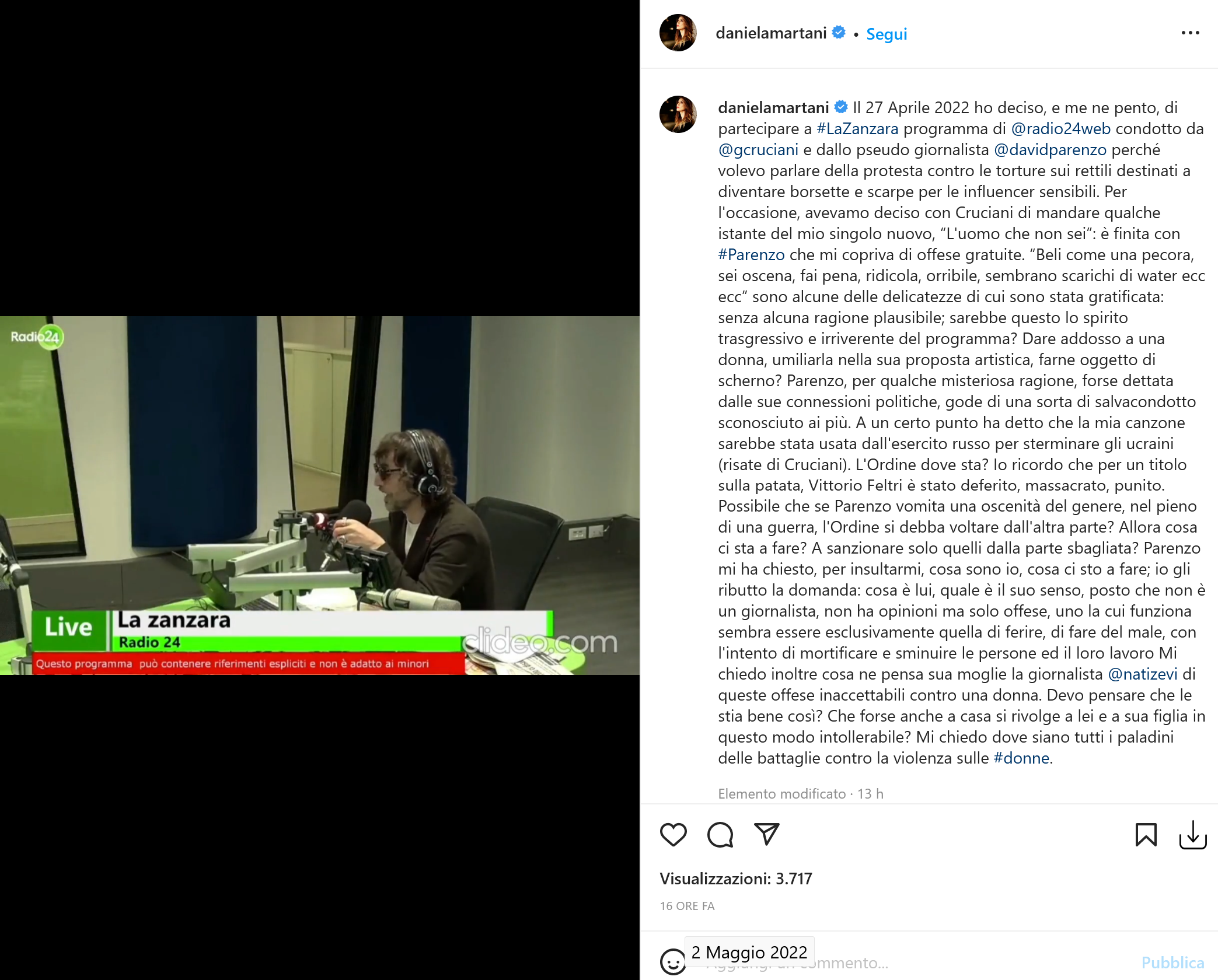 A un certo punto ha detto che la mia canzone sarebbe stata usata dall'esercito russo per sterminare gli ucraini (risate di Cruciani). L'ordine dove sta? Io ricordo che per un titolo sulla patata, vittorio feltri è stato deferito, massacrato, punito. Possibile che se Parenzo vomita una oscenità del genere, nel pieno di una guerra, l'ordine si debba voltare dall'altra parte? Allora cosa ci sta a fare? A sanzionare solo quelli dalla parte sbagliata? Parenzo mi ha chiesto, per insultarmi, cosa sono io, cosa ci sto a fare; io gli ributto la domanda: cosa è lui, quale è il suo senso, posto che non è un giornalista, non ha opinioni ma solo offese, uno la cui funziona sembra essere esclusivamente quella di ferire, di fare del male, con l'intento di mortificare e sminuire le persone ed il loro lavoro mi chiedo inoltre cosa ne pensa sua moglie la giornalista Nathania Zevi di queste offese inaccettabili contro una donna.