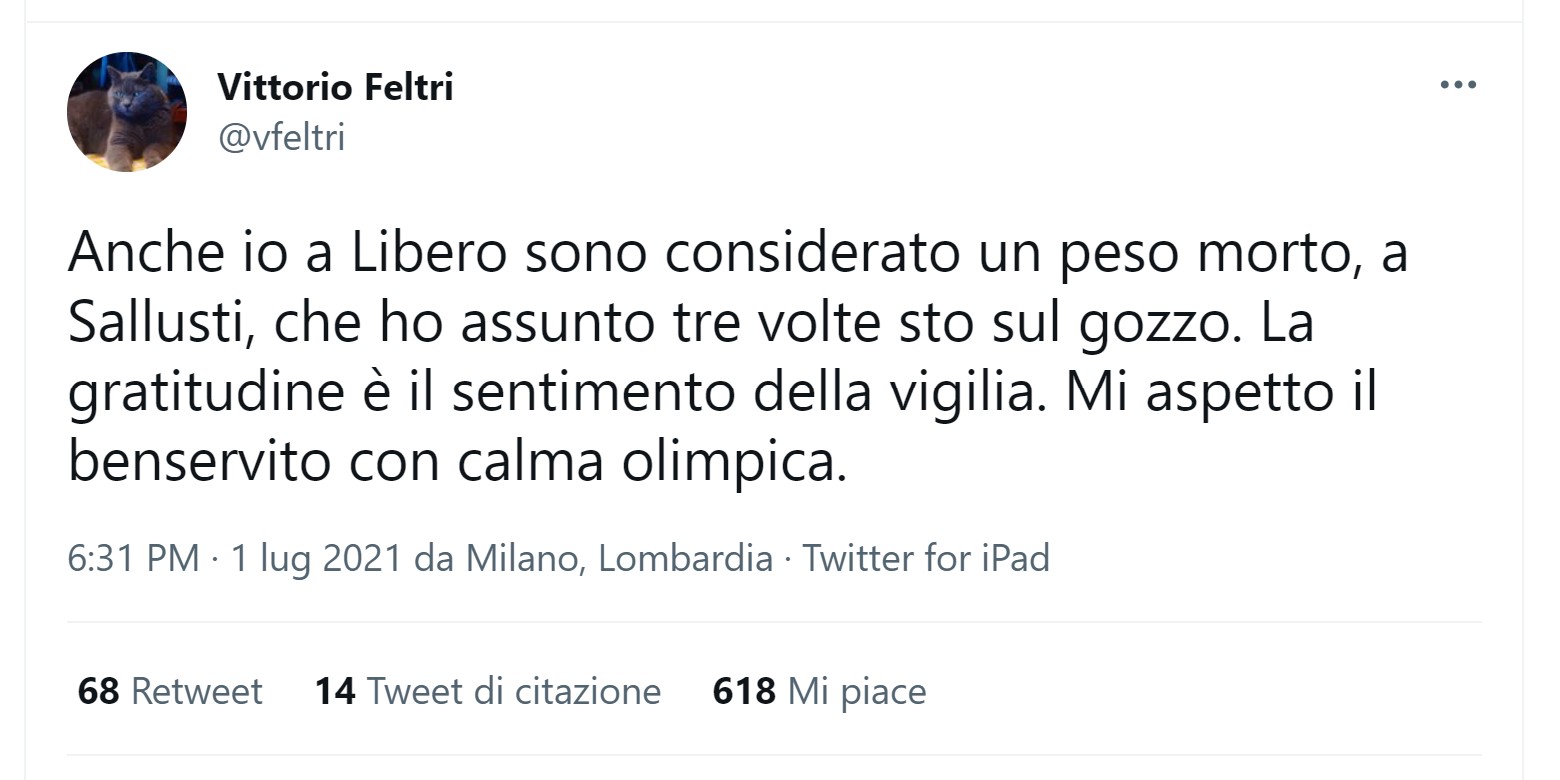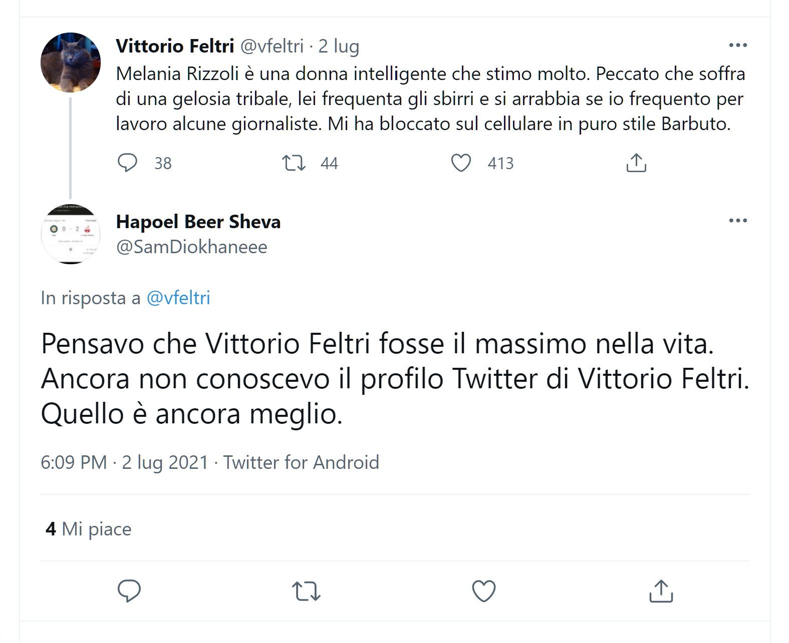 L’AUTODISTRUZIONE DI VITTORIO FELTRI A COLPI DI TWEET – IERI HA TUITTATO CONTRO SALLUSTI (“A ‘LIBERO’ SONO CONSIDERATO UN PESO MORTO. A SALLUSTI, CHE HO ASSUNTO TRE VOLTE, STO SUL GOZZO”), OGGI TOCCA A MELANIA RIZZOLI - FUORI DI SÉ PER ESSERE STATO ABBANDONATO DALL’AMICA DEL CUORE, IL 78ENNE GIORNALISTA “CINGUETTA” DISPERATO: “PECCATO CHE SOFFRA DI UNA GELOSIA TRIBALE, LEI FREQUENTA GLI SBIRRI E SI ARRABBIA SE IO FREQUENTO PER LAVORO ALCUNE GIORNALISTE. MI HA BLOCCATO SUL CELLULARE…”