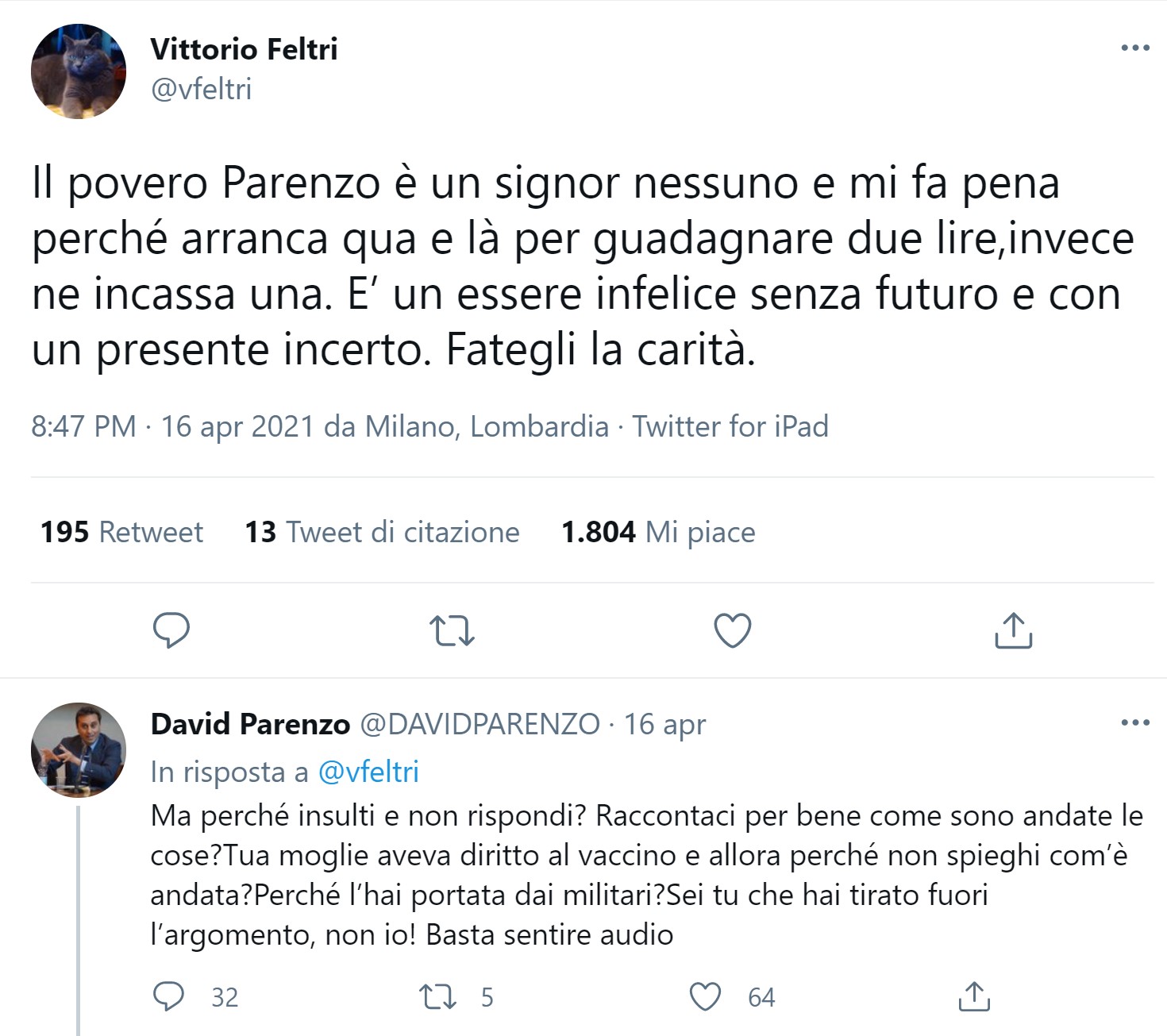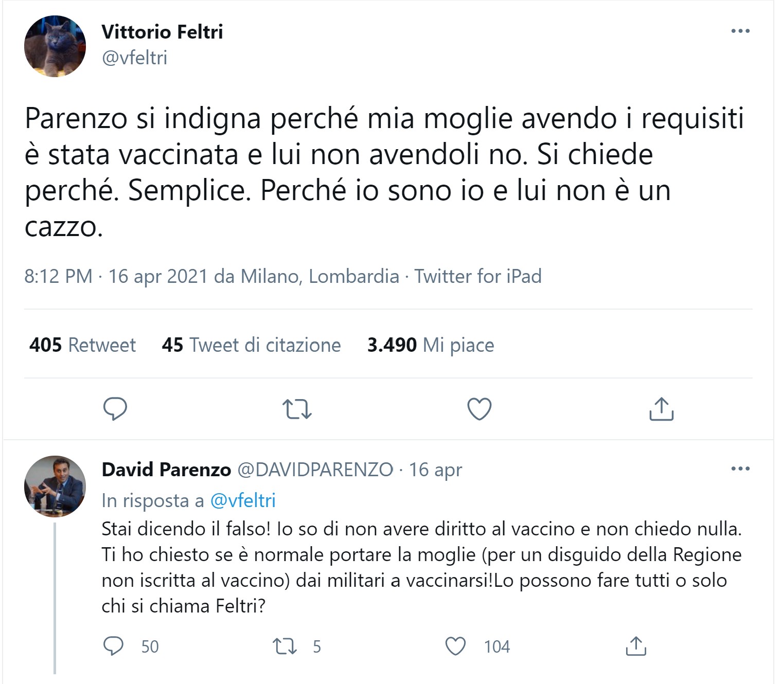 Il diverbio prosegue poi sugli schermi di Twitter.