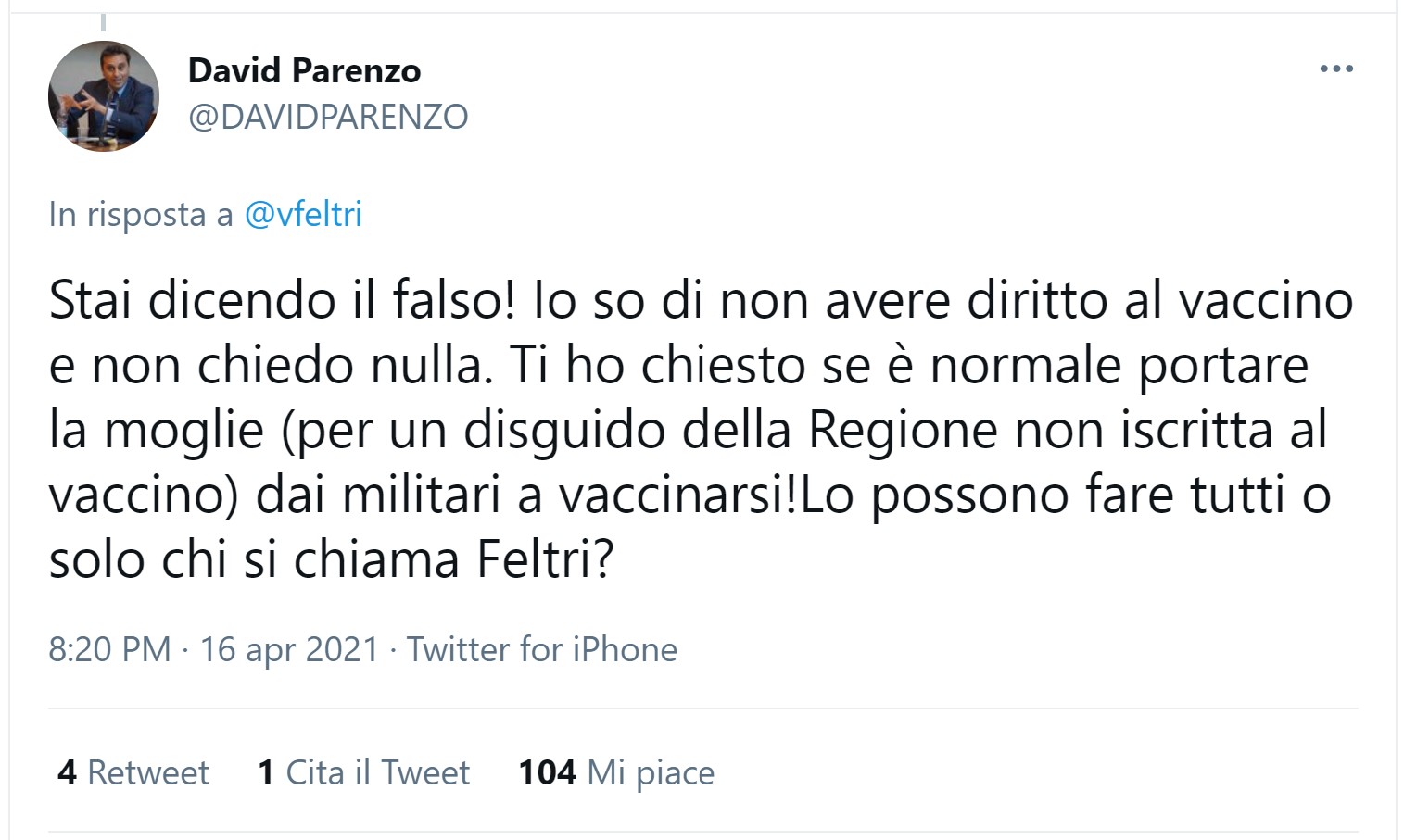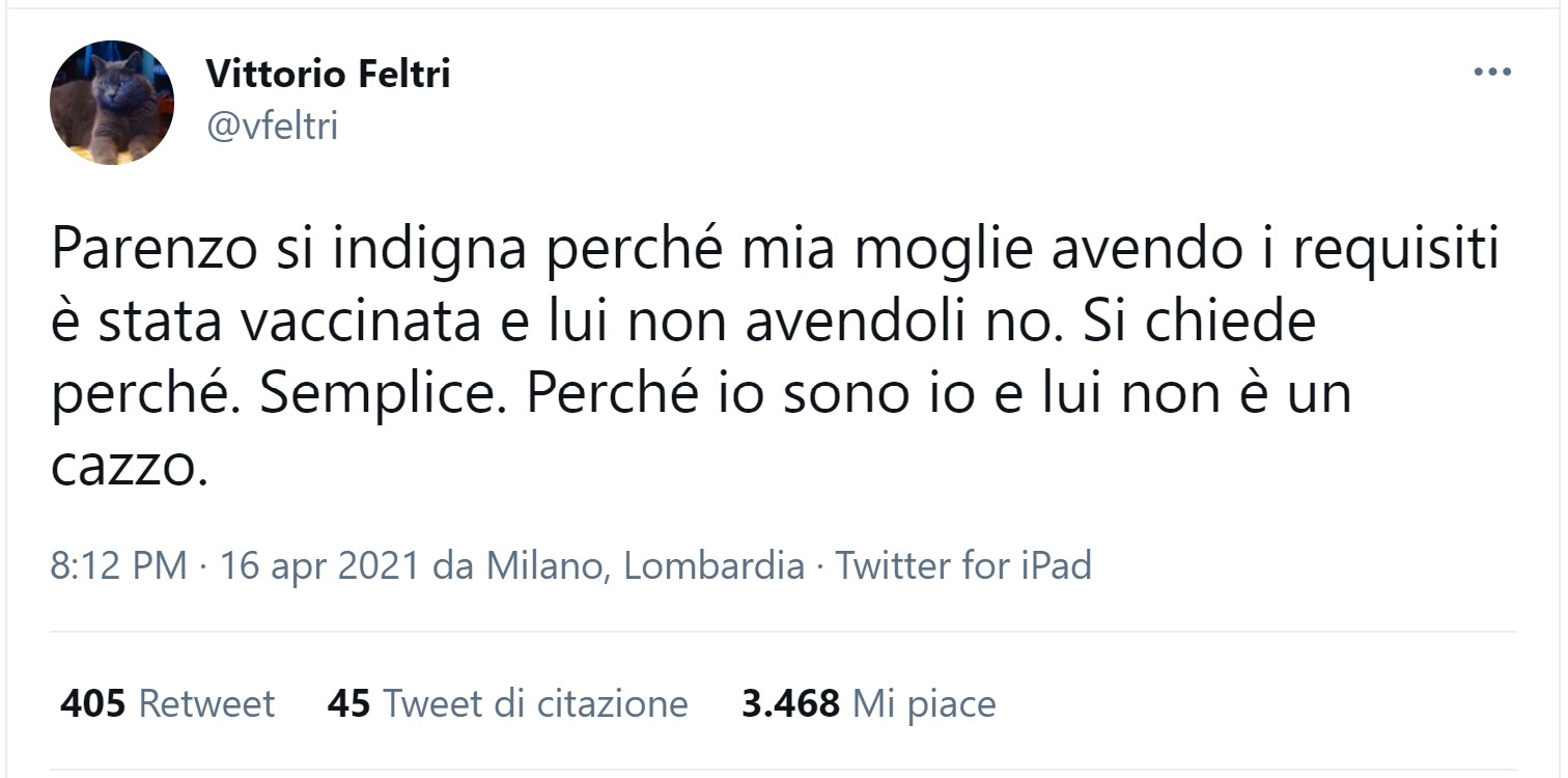 David Parenzo insinua che Vittorio Feltri abbia sfruttato le proprie aderenze, per consentire alla moglie di scavalcare la fila.
