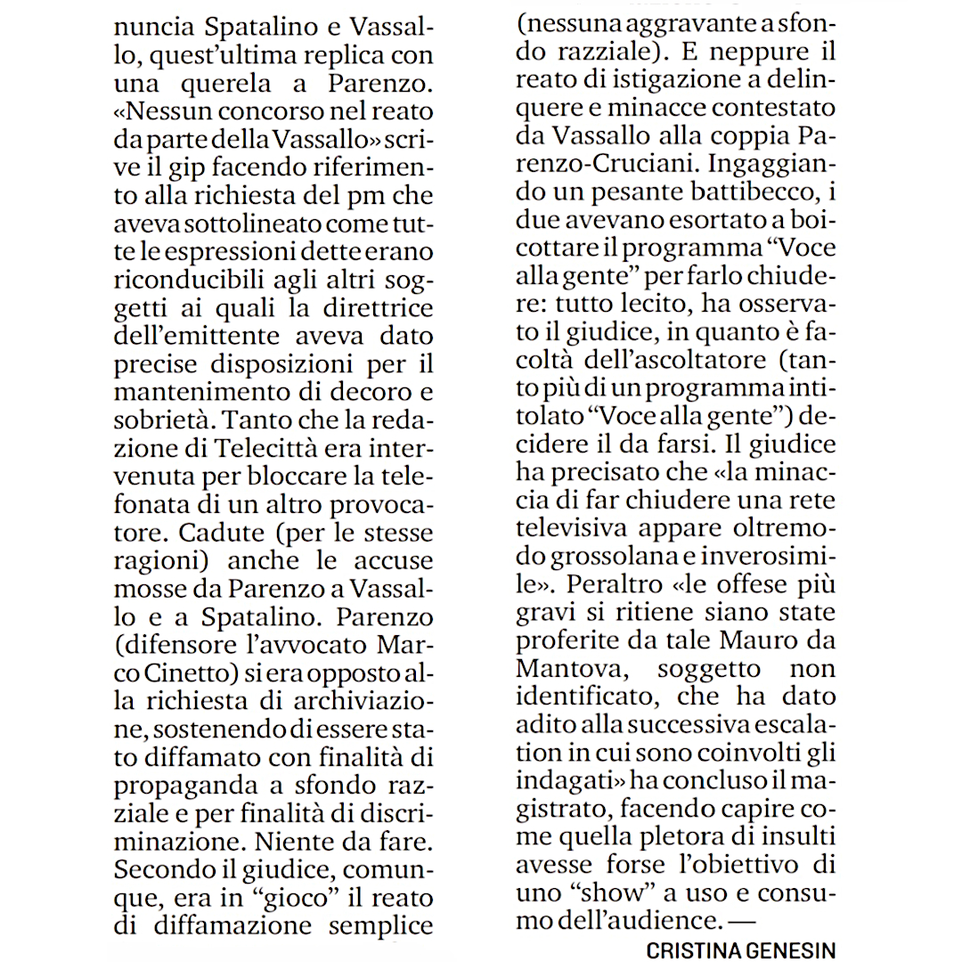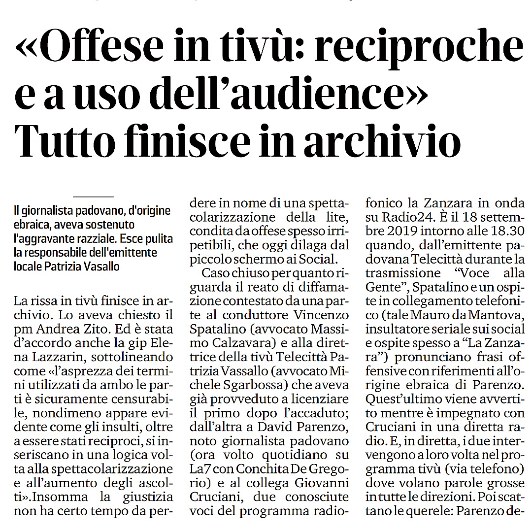 PADOVA Il pubblico ministero Andrea Zito ha richiesto l'archiviazione, ma la parte offesa ha fatto opposizione. Così il Gip Elena Lazzarin ha fissato per il 2 luglio l'udienza per decidere se richiedere un supplemento di indagini o archiviare il caso di diffamazione che è costato il licenziamento da Telecittà a Enzo Spatalino, denunciato da David Parenzo, co-conduttore de La Zanzara.